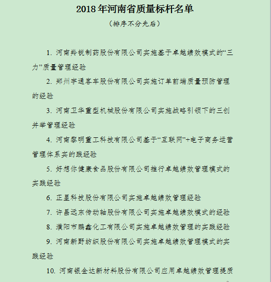 近日,河南省工信委“豫工信辦科〔2018〕96號文”公布了2018年河南省質(zhì)量標(biāo)桿名單。