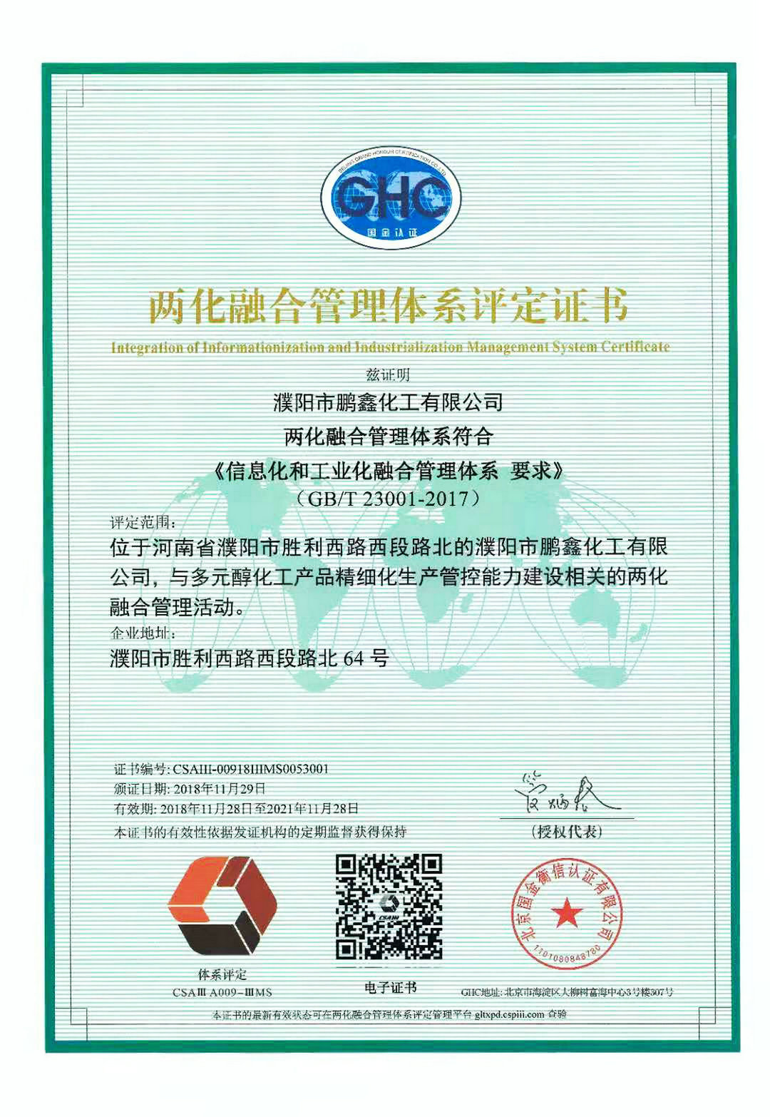 鵬鑫化工根據(jù)《信息化和工業(yè)化融合管理體系要求》(GB/T 23001-2017)標(biāo)準(zhǔn),于2018年4月啟動(dòng)“兩化融合”管理體系貫標(biāo)工作,經(jīng)過(guò)自主申報(bào)、體系運(yùn)行、內(nèi)部審核、管理評(píng)審、專家評(píng)審和復(fù)核公示等環(huán)節(jié),2018年11月28日正式通過(guò)評(píng)定,取得兩化融合管理體系評(píng)定證書(shū)(證書(shū)編號(hào):CSAIII-00918IIIMS0053001)。